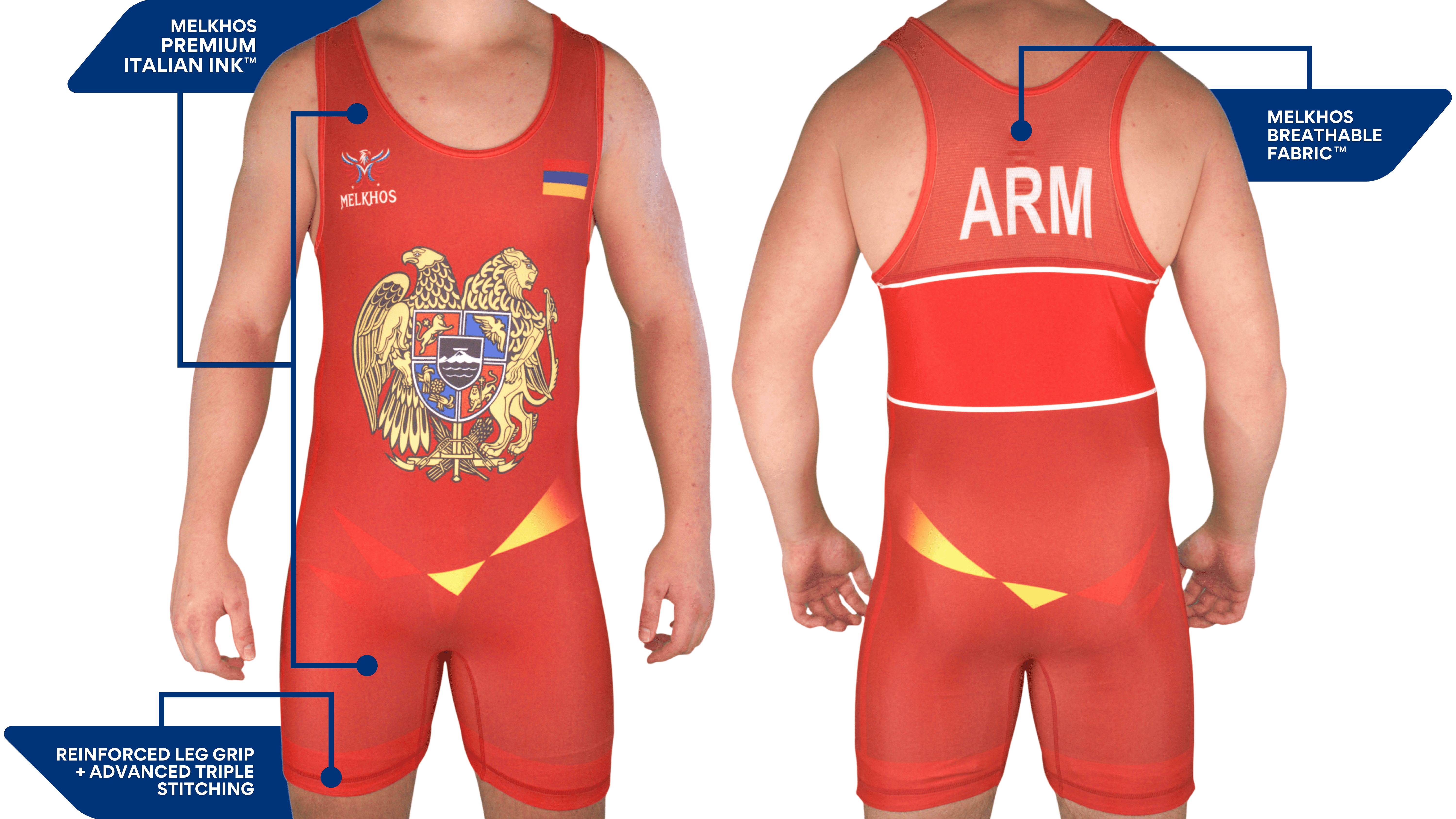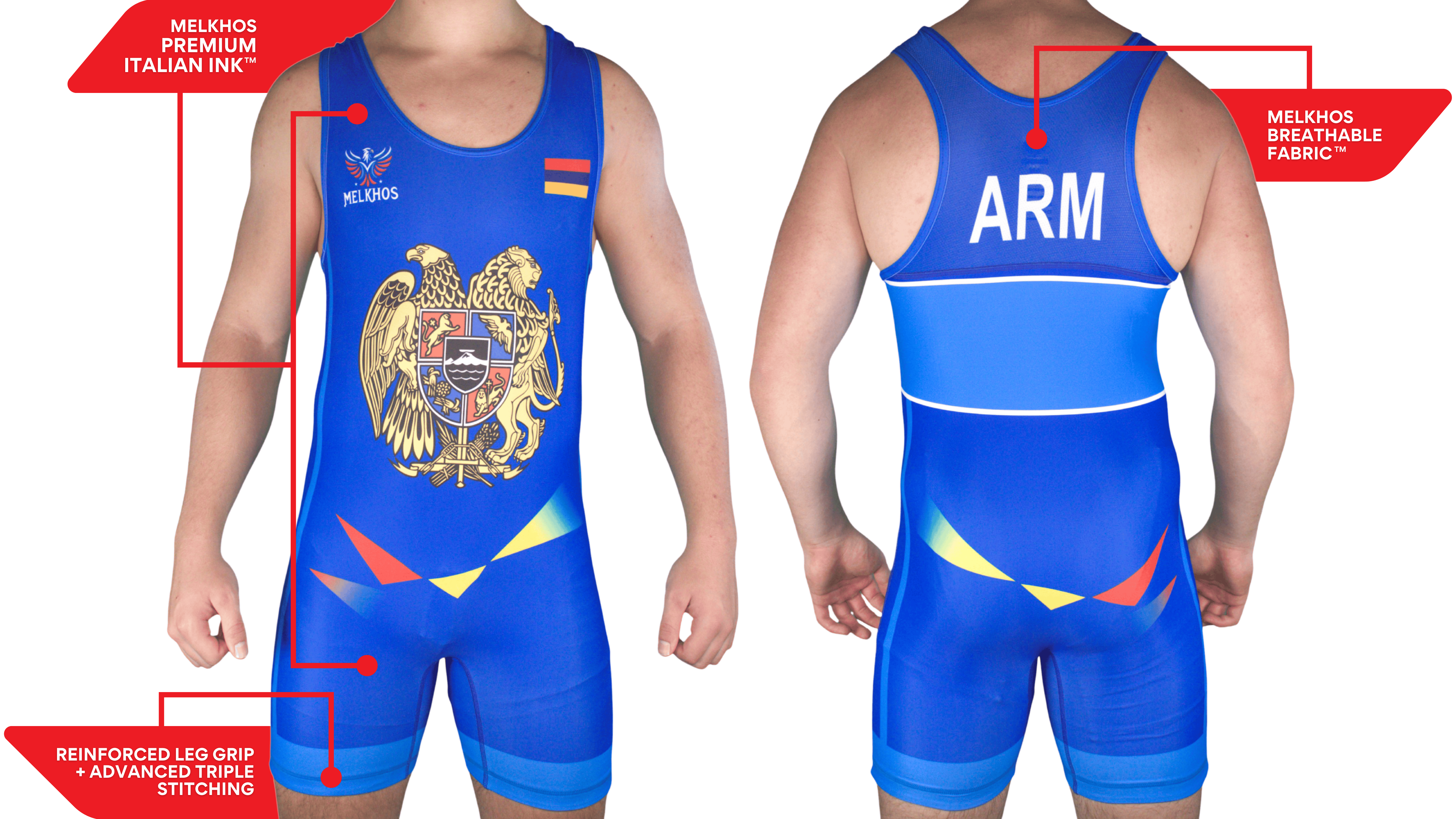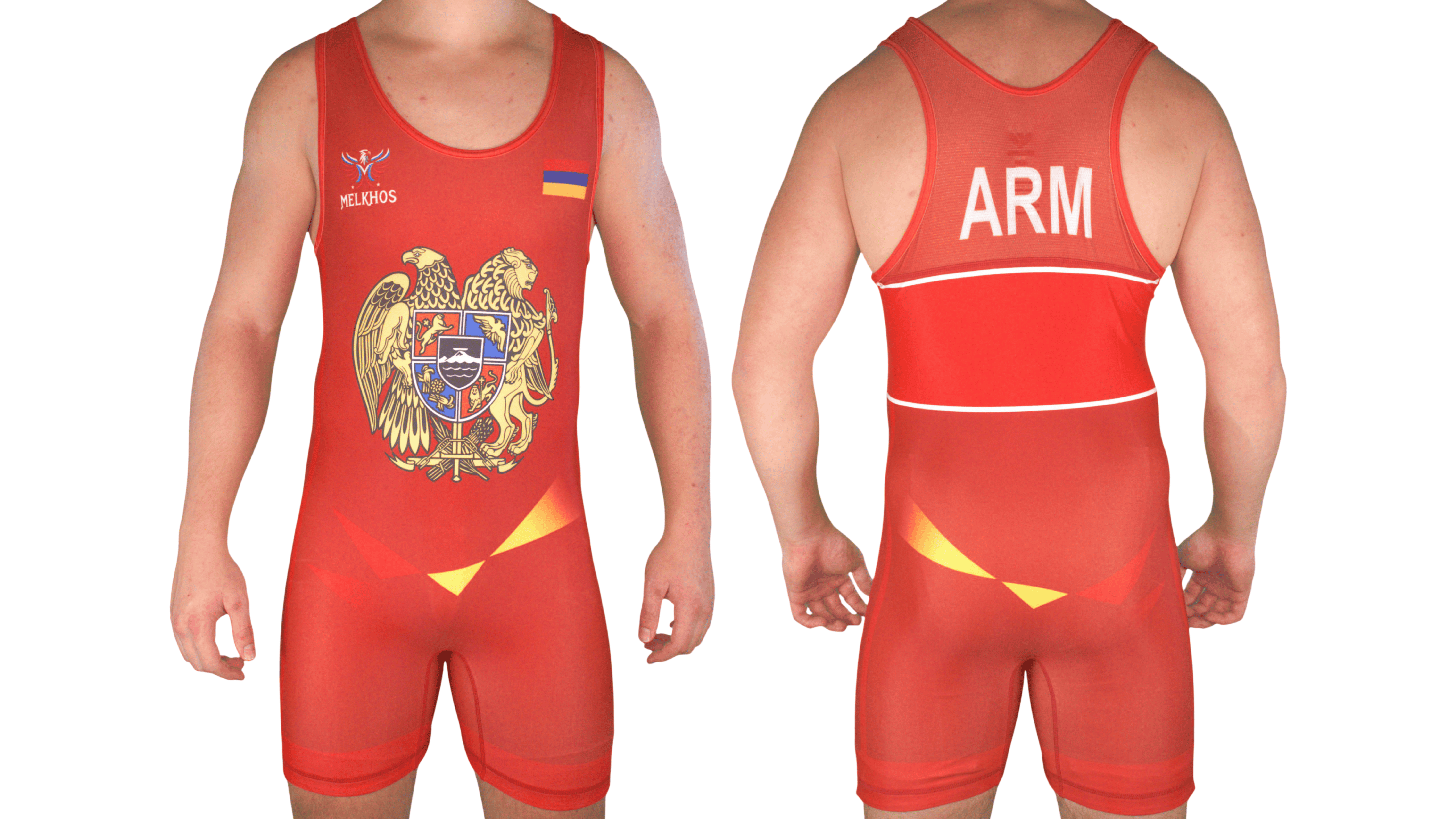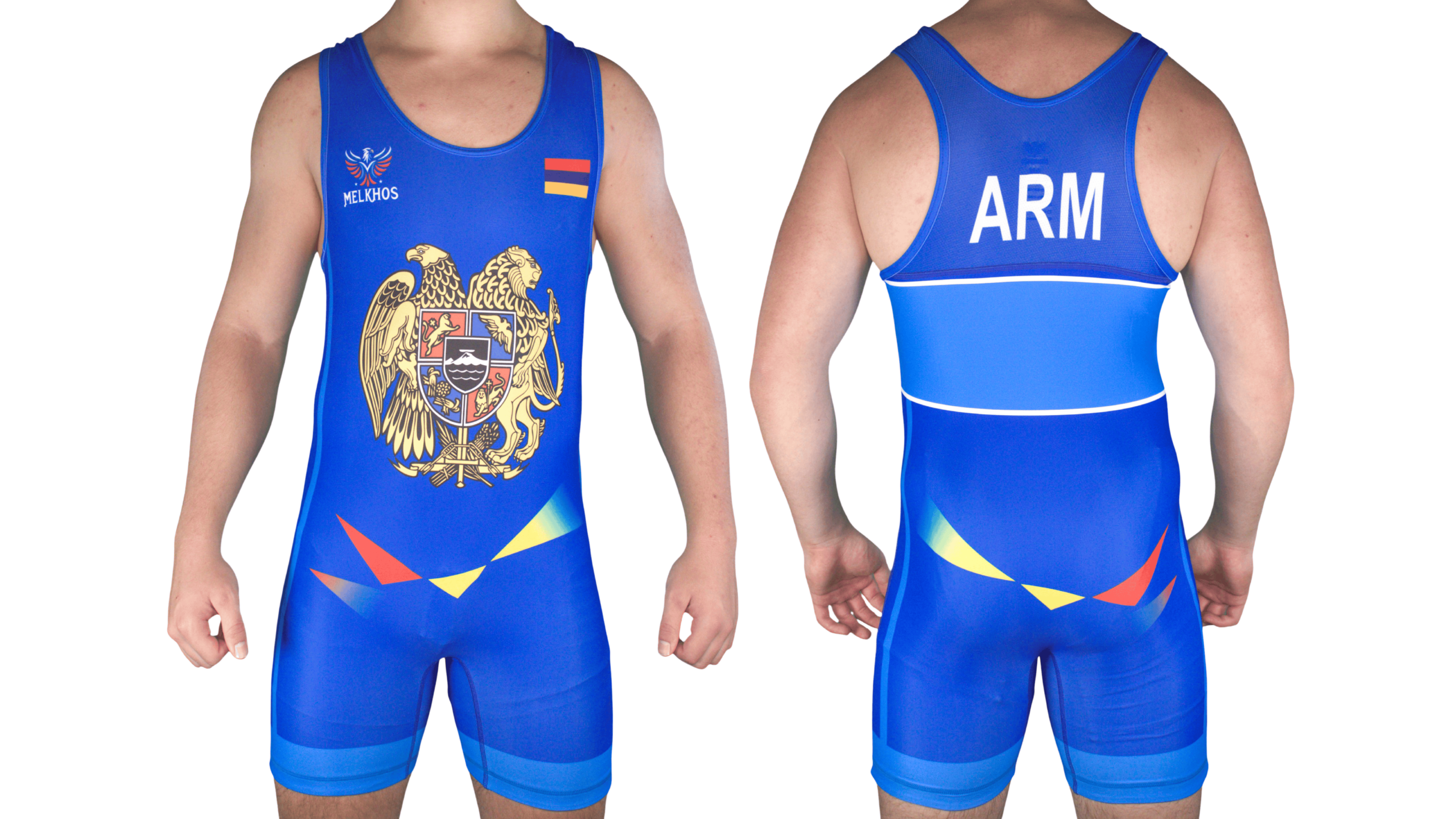 Step onto the mat with pride in the official MELKHOS Armenia National Team Singlet—available in Blue, Red, Black, or the Combo Pack (sizes S–3XL). The Combo Pack saves you 15% compared to buying individually. Each singlet is designed with the Armenian flag and national coat of arms crest, showcasing bold colors and iconic details that let you represent your heritage with strength and style.