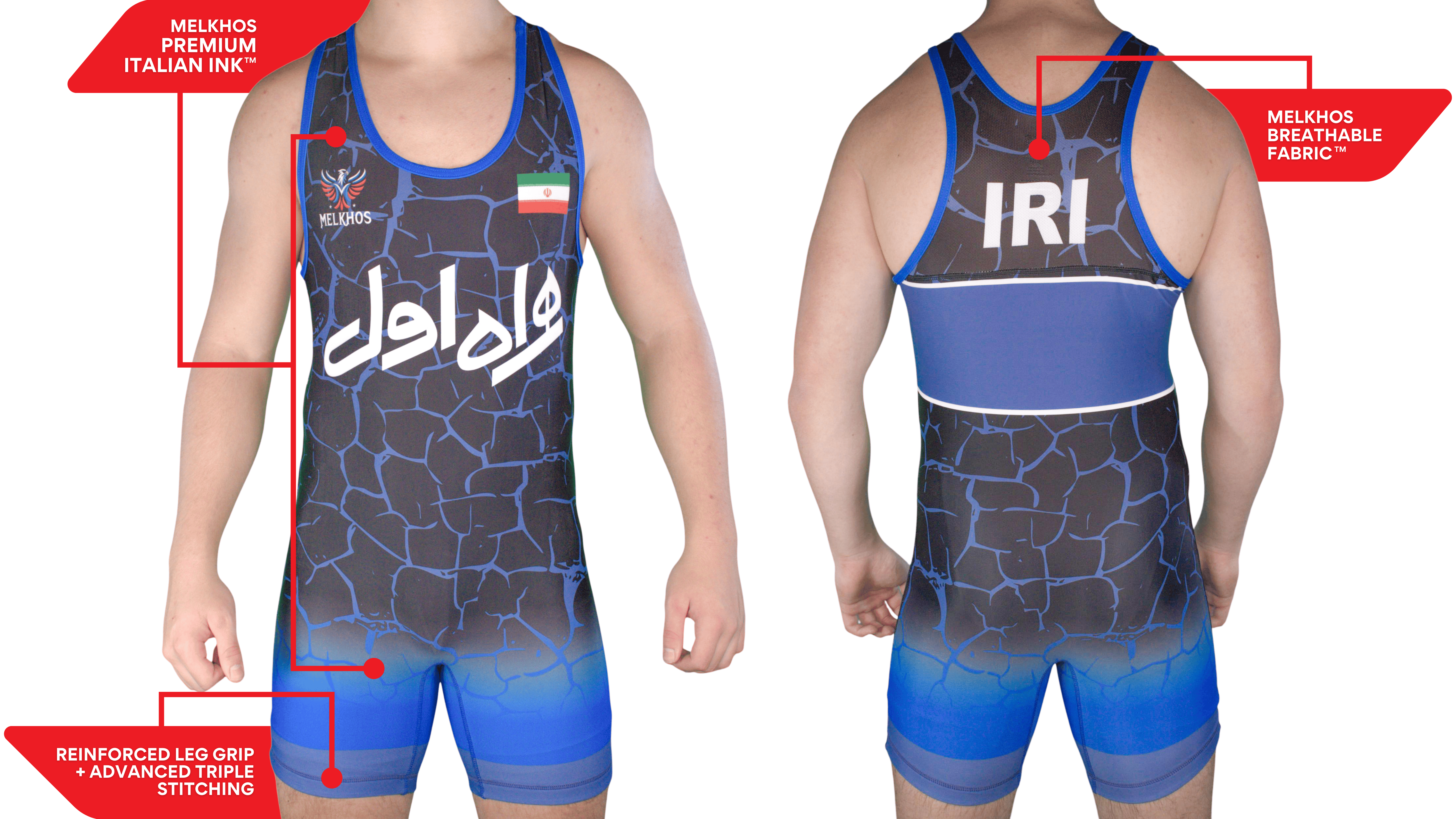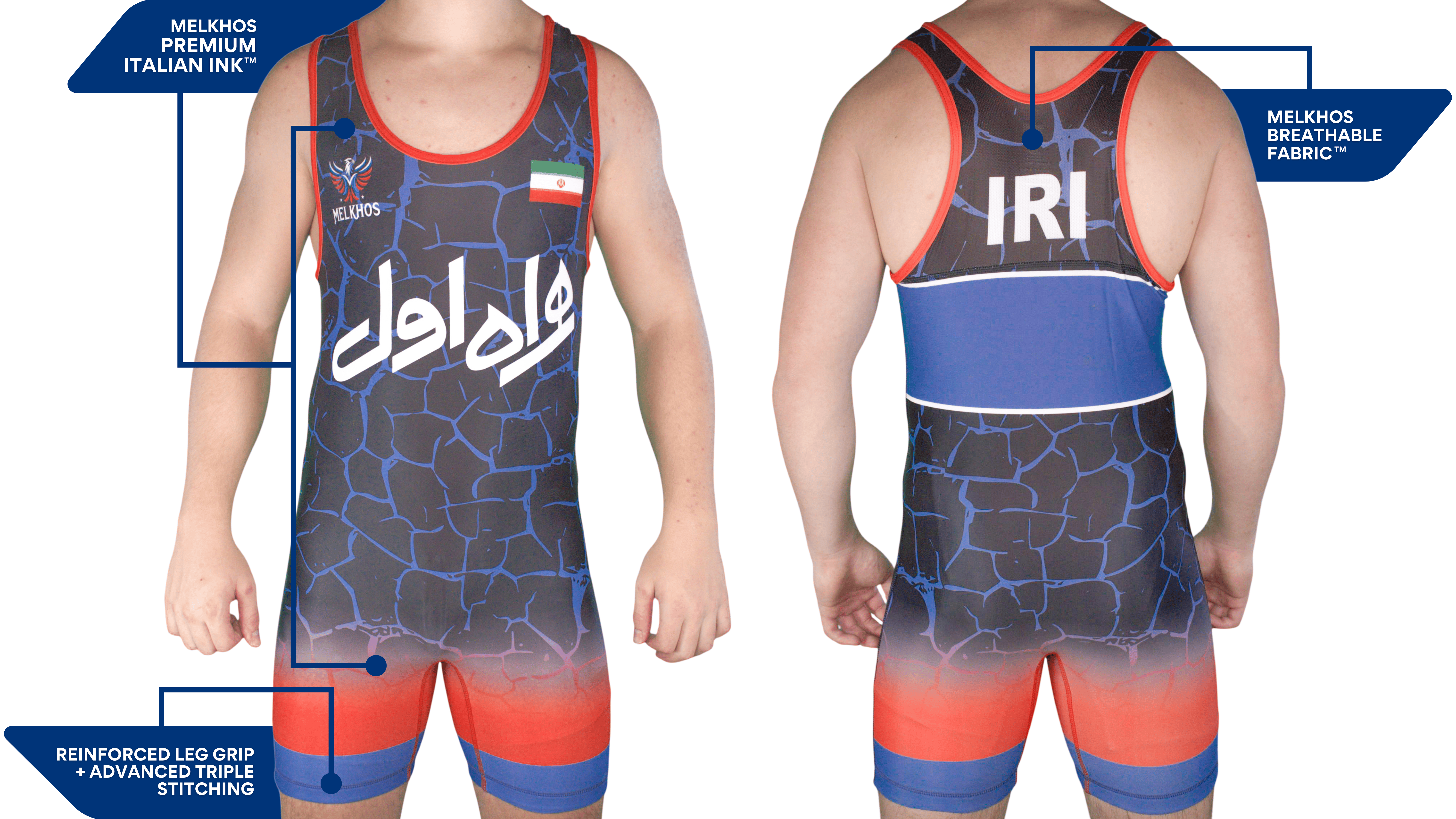 Step onto the mat with pride in the official MELKHOS Iran National Team Singlet—available in Blue, Red, or the Combo Pack (sizes S–3XL). The Combo Pack saves you 15% compared to buying individually. Each singlet is designed with the iconic tricolor flag of green, white, and red, and the national emblem. The emblem features a stylized word "Allah" with four crescents and a sword, symbolizing strength and faith, and is a representation of Iran's spirit, allowing you to honor a powerful heritage with every match.